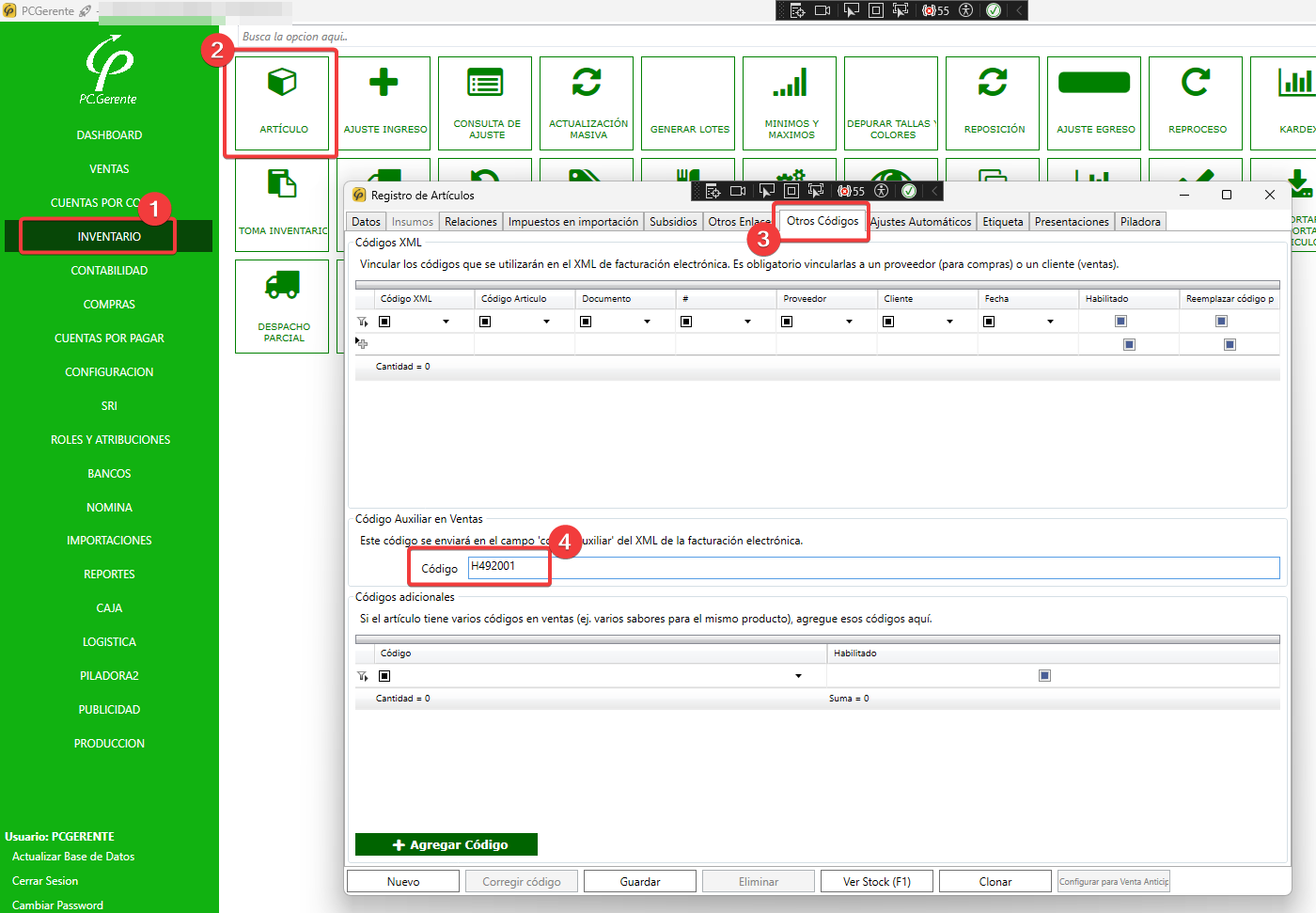 COMO AÑADIRLE EL CODIGO AUXILIAR H492001 EN LAS FACTURAS