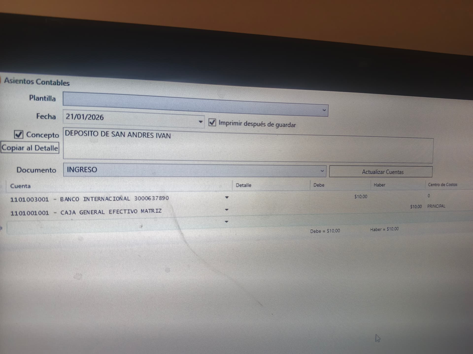 Buenas noches tengo un problema deseo hacer un asiento y se aumenta una linea, está línea no la puedo borrar , no se que hacer esto ocurre desde diciembre